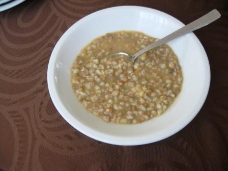 In un tegame alto soffriggete nell’olio extra vergine di oliva un trito di cipolla, sedano carota, unite poi un poco di polpa di pomodoro. Aggiungete del brodo vegetale, e versate la miscela di legumi e cereali, mescolando a fuoco basso, per circa quaranta minuti, aggiustando di sale. Si manteca con parmigiano, un filo d’olio a crudo e una macinata di pepe fresco.