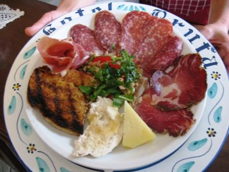Il nome trattoria, scelto da questa famiglia di ristoratori della prima metà del novecento, i cui discendenti continuano ancor oggi a proporre i piatti genuini del luogo, parla già della scelta di una piena aderenza al territorio e alla sua cucina più genuina. La trattoria infatti richiama alla mente luoghi e cucine dove si mangiava e si mangia, dove di beveva e si beve e ci si incontrava tutti insieme in mezzo al gusto di piatti veri. E questo ancor oggi lega i pronipoti di Gigetto a Monteleone, il gusto di creare piatti del luogo, dove il farro regna sovrano. Siamo infatti a Ruscio, l’areale per eccellenza del farro, a pochi chilometri da qui, la spiga miracolosa cambia forma e contenuti, non è più il farro Dop di Monteleone di Spoleto, il triticum dicoccum durum. Questa insalata di farro, creata da Luigi, ripercorre una delle prime utilizzazioni del farro che veniva lessato, pur nella sua variante più moderna che prevede una semi perlatura del chicco, appena graffiato, per agevolarne la cottura e l’insaporimento. Questo antipasto è un piccolo capolavoro di delicatezza e aromaticità.